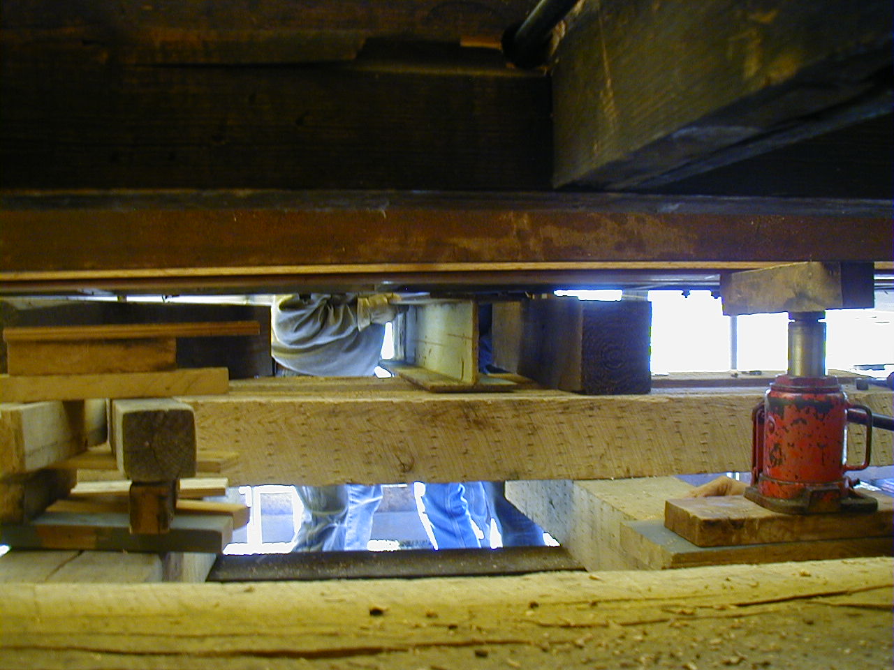 Tom is manning one of the jacks at the end of the car.  The ends tended to droop due to the flexibility of the frame, and had to be levelled.