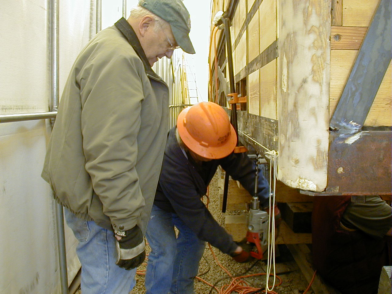 Here Ron and Bill are preparing to raise the needle beam into position using an ingenious and one-of-a-kind mechanism to accomplish this. The beam is surprisingly heavy, not your average 4x4.